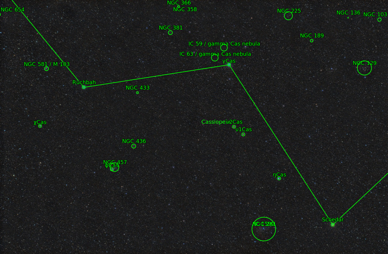 Расположенное на фоне Млечного Пути созвездие Кассиопеи содержит множество объектов ДипСкай, в основном это звездные скопления и галактические тумманности.