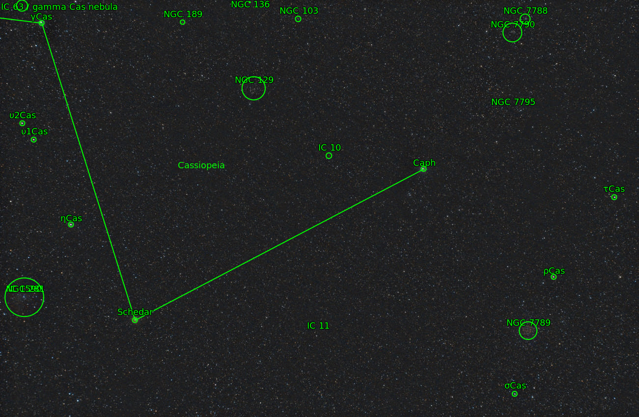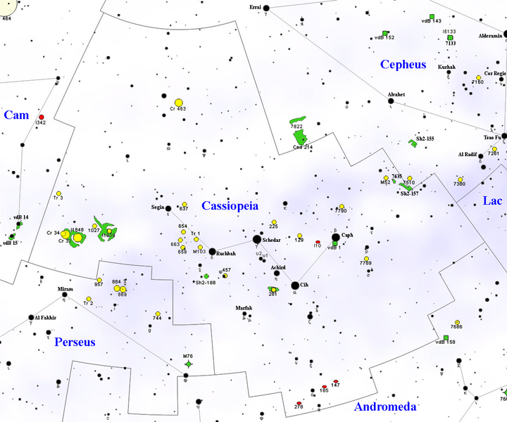 Расположенное на фоне Млечного Пути созвездие Кассиопеи содержит множество объектов ДипСкай, в основном это звездные скопления и галактические тумманности.