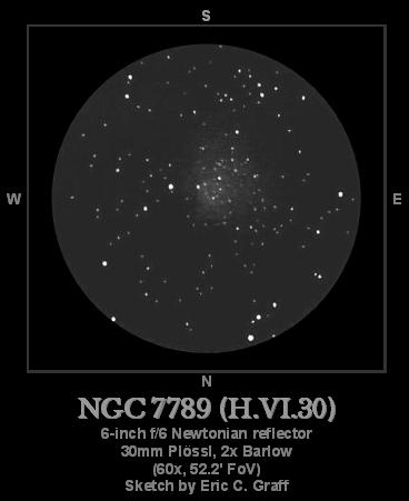 Ещё отметим звездное скопление NGC 7789. Блеск 6,7m, видимый размер 25'. Оно находится между ρ Кассиопеи и σ Кассиопеи. В 200-мм телескоп видно множество мелких звезд, как бы закрученных в водоворот и рассыпанных на площади почти равной поперечнику Луны. На западе это скопление называют «Белая Роза» или «Роза Каролины», так как это скопление было открыто Каролиной Гершель в 1783 году. Некоторые российские любители астрономии называют это скопление «Тарелка». Примерный вид скопления в 150 мм телескоп.