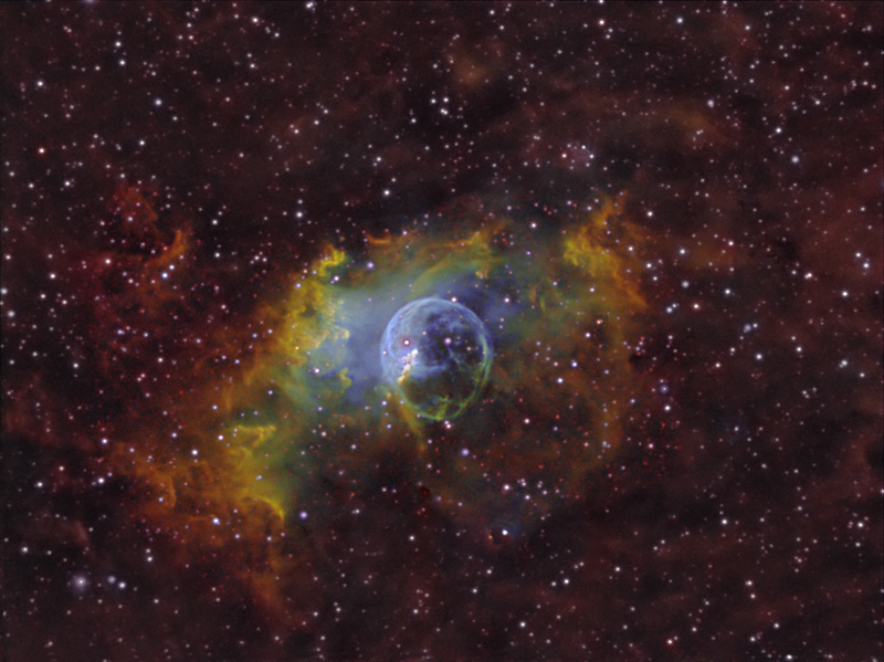 Туманность «Пузырь» (NGC 7635) – эмиссионная туманность, образовавшаяся за счет звездного ветра массивной звезды BD+602522. Блеск 11m, видимый размер 15х8'. На небе расположена неподалеку от скопления М52, хотя реально находится от него в 2 раза дальше (11000 св.лет). На снимках туманность видна как раздувшийся пузырь, но немного деформированный с одной стороны из-за сопротивления молекулярного облака, которое тоже хорошо видно на фотографиях. К сожалению, даже для владельцев 300-мм телескопов это нелегкий объект. Различить туманность поможет фильтр O-III.