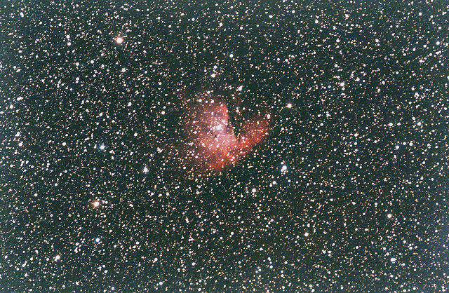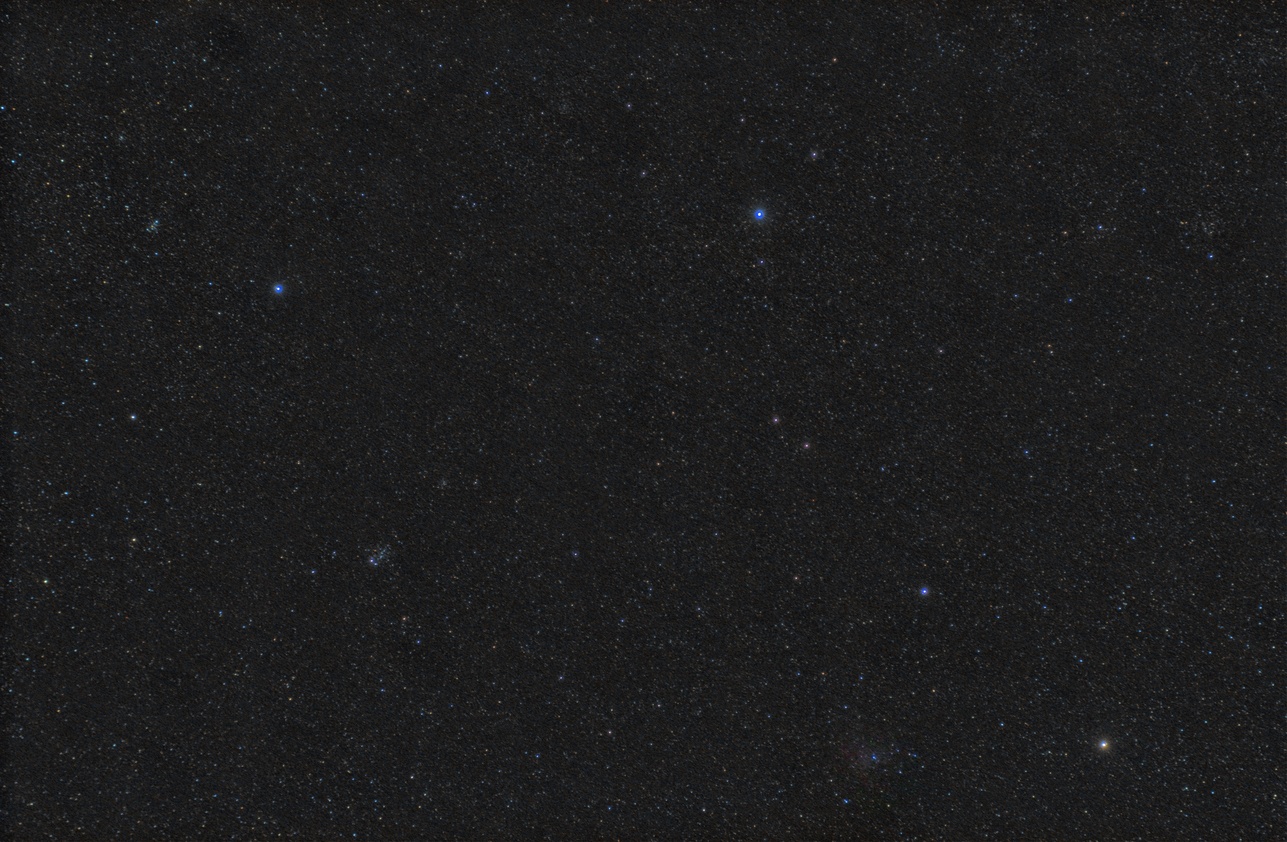 М 52 (NGC 7654) – самое известное рассеянное скопление в Кассиопее. Блеск 6,9m, видимый размер 13'. Его можно наблюдать даже в бинокль в виде искристого туманного пятнышка. В 130-мм телескоп различается десятка два желтоватых звезд. В 200-мм телескоп можно увидеть богатую (до сотни) россыпь мелких звезд. Можно сказать, «бросается в глаза» самая яркая (8,6m) звезда скопления оранжевого цвета. На западе это скопление называют Cassiopeia Salt-and-Pepper. Иногда еще называют скопление Скорпион. Найти скопление довольно легко, оно находится на прямой линии из звезд Шедар и Каф на расстоянии от Каф, равное расстоянию между этими звездами. Примерный вид скопления в 200-мм телескоп.