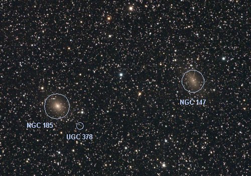 В Кассиопее есть две галактики, видимые в средние телескопы, это галактика NGC 185 и NGC 147. NGC 185 - карликовая эллиптическая галактика. Блеск 9,3m. Видимые размеры 11′,7 × 10′,0. При хороших условиях различается в телескоп диаметром до 100мм.