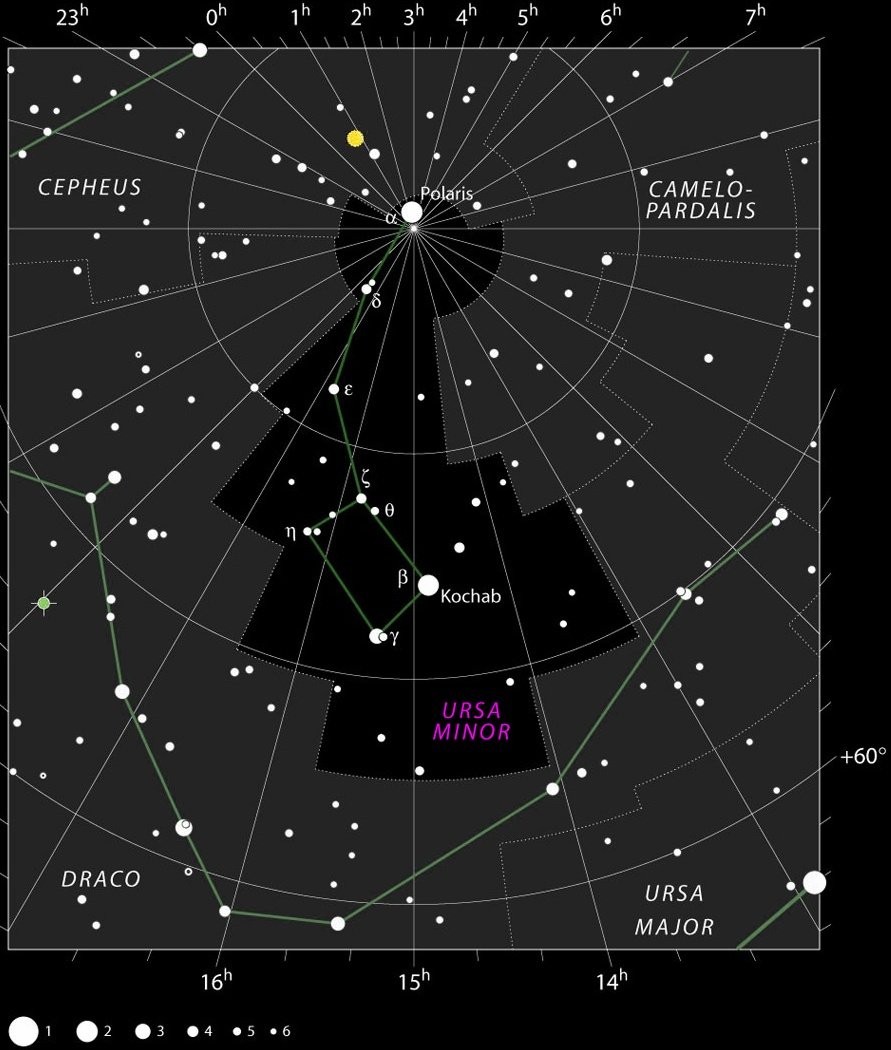 Полярная (α UMi) - желтый сверхгигант. Без преувеличения можно сказать, что это самая известная звезда. В настоящее время она расположена в 44’ от северного полюса мира и потому практически точно указывает на север, а высота над горизонтом примерно равна географической широте места наблюдения . В следствие прецессии в 2102 году она будет находиться на минимальном расстоянии от полюса в 27,4’.