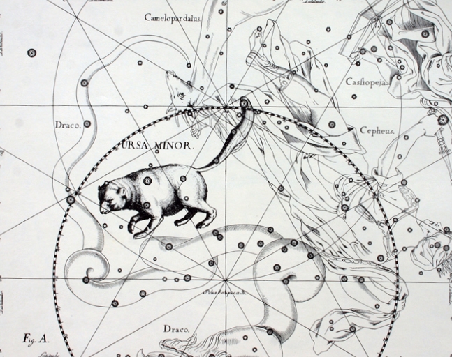 С Малой Медведицей связана легенда о рождении главного божества греков Зевса. Чтобы спасти своего сына от отца Крона, поедавшего своих детей, богиня Гея унесла Зевса на вершину горы Иды, в священную пещеру, и оставила на попечение нимфам. Нимфы и их мать Мелисса (ее также называли Киносура) трогательно заботились о будущем владыке мира. В благодарность Зевс позднее вознес Мелиссу на небо, определив ей там самое почетное место: на многих старинных картах Малая Медведица именуется Киносурой. Однако это название, означающее хвост собаки, больше употреблялось для обозначения Полярной звезды. Это и неудивительно - римляне в созвездии видели Спартанских собак и щенков. Рисунок из атласа Гевелия.