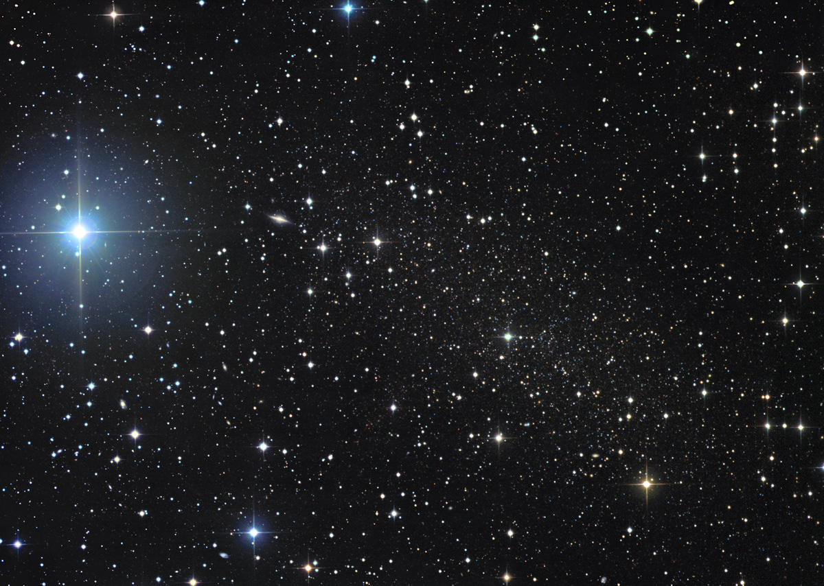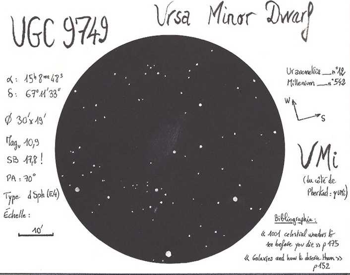UGC 9749 - карликовая эллиптическая галактика, один из ближайших спутников нашей Галактики. Расстояние до неё немного превышает расстояние до Магеллановых облаков и составляет всего около 200 тысяч световых лет, а размеры её всего пару-тройку тысяч св. лет. Блеск галактики 11,9m и, казалось бы, это должен быть нетрудный объект для любителей астрономии. Но это не так. Видимые размеры галактики 30′,2 × 19′,1 и, соответственно её поверхностная яркость очень низка. Фактически звезды UGC 9749 теряются на фоне звезд нашей Галактики. Открыта она была лишь в 1954 году в Паломарской обсерватории. Для наблюдений галактики нужен телескоп не менее 300 мм. Сфотографировать её попроще.
