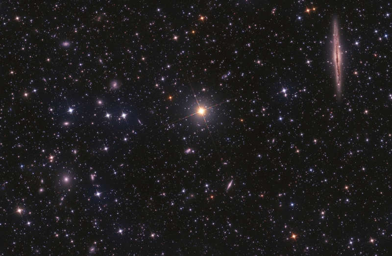 Далекие галактики находятся позади звезд Млечного Пути, окруженных дифракционными лучами, на этом изображении, полученном с помощью телескопа. Поле зрения изображения – около одного градуса, оно показывает вид неба в северном созвездии Андромеды, где можно увидеть много галактик, а в центре снимка – желтоватая звезда HD 14771. Вверху справа находится большая спиральная галактика NGC 891, ее размер – 100 тысяч световых лет, и мы видим ее почти точно с ребра. NGC 891 удалена от нас на 30 миллионов световых лет, она похожа на наш Млечный Путь – ее диск такой же тонкий. Диск и центральный балдж в середине прорезаны темными, поглощающими свет пылевыми облаками. Слева внизу на картинке видны галактики, принадлежащие скоплению галактик Эйбелл 347. Скопление Эйбелл 347 удалено от нас почти на 240 миллионов световых лет, на этом четком телескопическом изображении хорошо видны входящие в него большие галактики. По физическим размерам они похожи на NGC 891, однако находятся почти в 8 раз дальше, поэтому их видимые размеры составляют примерно одну восьмую от NGC 891. Авторы и права: Ласло Баги