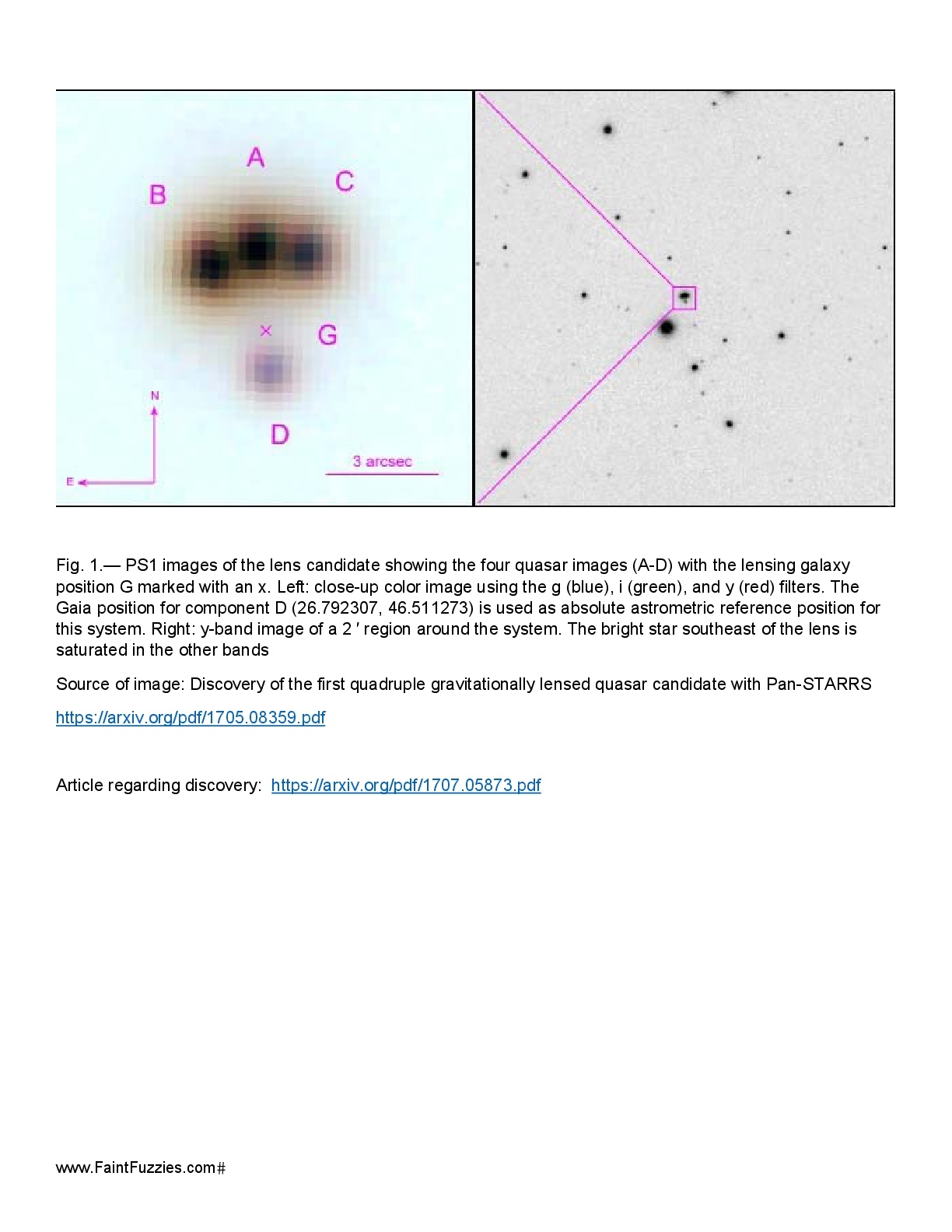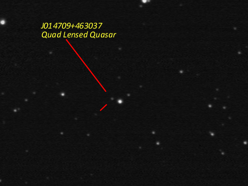 Попалась довольно интересная информация об объекте в созвездии Андромеды, хотя для любительских наблюдений весьма трудном. Это гравитационно-линзированный квазар J014709+463037 (Парашют Андромеды). Компоненты имеют видимый блеск 15.6, 15.7, 16.4, 18.1m, соответственно их визуальное обнаружение возможно только в крупные любительские телескопы. Он находится на расстоянии около 11 миллиардов св. лет! Изображение квазара состоит из 4-х компонентов, получившихся из-за гравитационного линзирования расположенной на луче зрения более близкой галактикой.