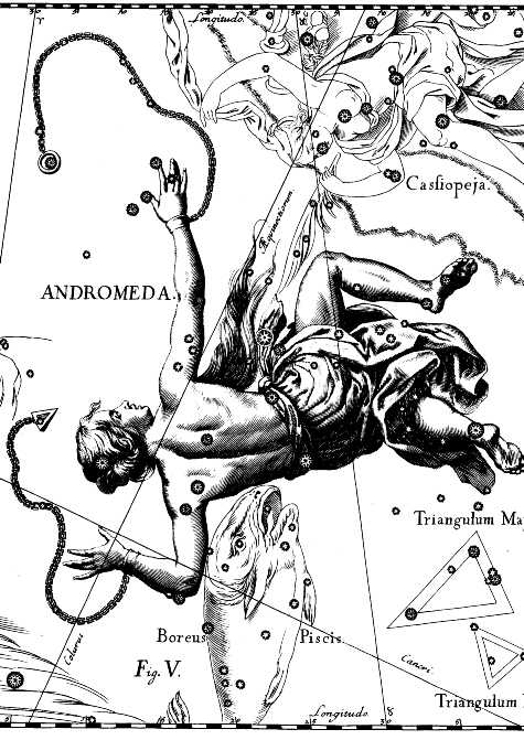 По древнегреческому мифу прекрасная дева Андромеда, дочь Цефея и Кассиопеи, была прикована к скалам для того, чтобы искупить вину матери, которая прогневала морских нимф. Гордясь своей красотой, Кассиопея сказала, что она прекраснее всех на свете. Разгневанные нимфы уговорили грозного бога моря Посейдона наслать на царство Цефея морское чудовище Кита. Кит всплывал из моря и опустошал эфиопские земли. Оракул предсказал, что если морскому чудищу отдадут на растерзание прекрасную Андромеду, то кара Посейдона окончится. Заковали в цепи у моря Андромеду, ждет она своей гибели. Но увидел ее Персей, пролетавший мимо в крылатых сандалиях, и понравилась ему царевна. Персей спас Андромеду от морского чудовища, превратив его в камень при помощи головы, побежденной им Горгоны Медузы, и женился на Андромеде. Позднее все герои этого мифа были помещены на небо в виде красивых созвездий.