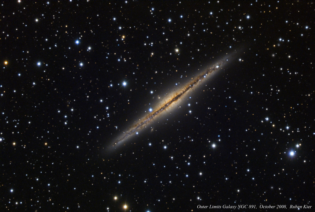 NGC 891 - спиральная галактика, наблюдаемая практически с ребра. Имеет блеск 10,1m и видимые размеры 11,7' × 1,6'. На темном небе может быть обнаружена и в 100-мм телескоп в виде светлой полоски. В 200-мм телескоп может быть замечена темная полоса газо-пылевой материи вдоль галактики. Но, все таки это объект для крупных телескопов, в которые смотрится во всей красе.