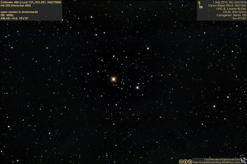 NGC 7686 – рассеянное звёздное скопление. Имеет блеск 5,6m и видимые размеры 15,0'. Включает около 40 звезд 8-11m. Довольно разреженное, находится среди двух более ярких желтоватых звезд.