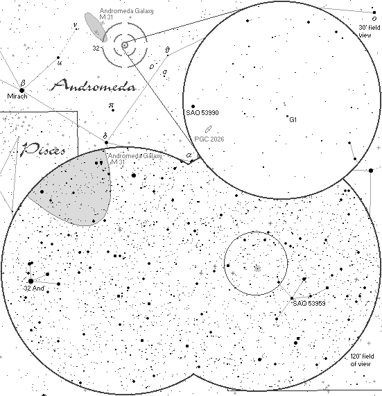 G1 (Mayall II) - шаровое скопление с малозаметным блеском 13,7m и видимым размером 0,6'. И ничего не было бы в нем необычного, если бы не его местонахождение в Туманности Андромеды на расстоянии 2,5 млн. св. лет! И оно может быть замечено даже в 200-мм телескоп! При большом везении, конечно. Хотя есть предположение, что G1 это ядро карликовой галактики, поглощенной ранее её гигантской соседкой.