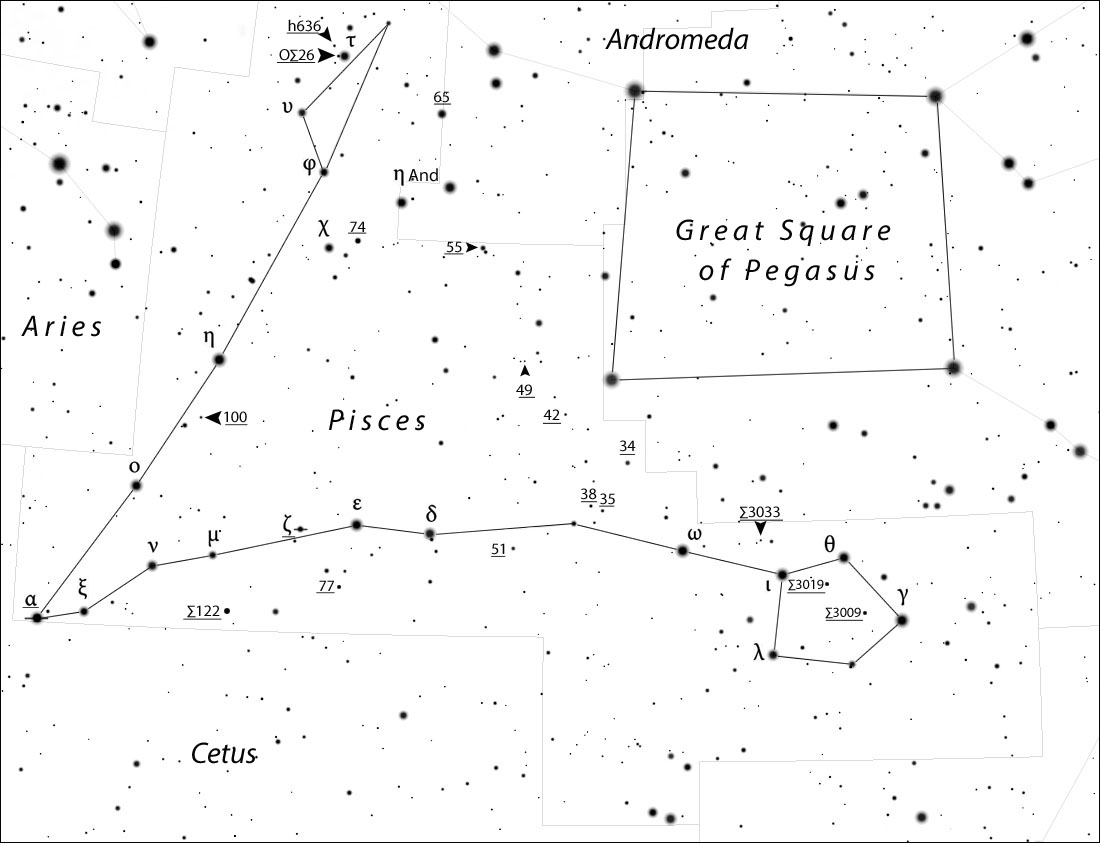 φ Psc - главный компонент оранжевого цвета с блеском 4,65m имеет спутник 9,11m на расстоянии 7,9". Расстояние до системы около 380 св.лет. ψPsc – красивая пара голубоватых звезд почти одного блеска - 5,27m и 5,45m, разделенная промежутком в 30". Легко делится даже в малые телескопы. Кроме того, у этой пары имеется оптический спутник с блеском 11,2m на расстоянии 91". ζ Psc - главный компонент белого цвета с блеском 5,22m имеет желтоватый спутник 6,15m на приличном расстоянии 22,8". Красиво смотрится в малые телескопы. 34 Psc - главный компонент с блеском 5,54 имеет компаньона 9,44m на расстоянии 7,7". 35 Psc - главный компонент желтого цвета с блеском 6,02m имеет голубоватый спутник 7,6m на расстоянии 11,5". Хорошо смотрится в малые телескопы. 42 Psc - главный компонент с блеском 6,4m имеет спутник 10,3m на расстоянии 31,7". 55 Psc - главный компонент желтого цвета с блеском 5,6m имеет голубоватый спутник 8,5m на расстоянии 6,6". Этот объект лучше смотрится в средние и крупные телескопы. 65 Psc – красивая пара белых звезд одинакового блеска - 6,33m и 6,34m, разделенная промежутком в 4,3". Увеличение желательно применять побольше. Карта с двойными звездами.