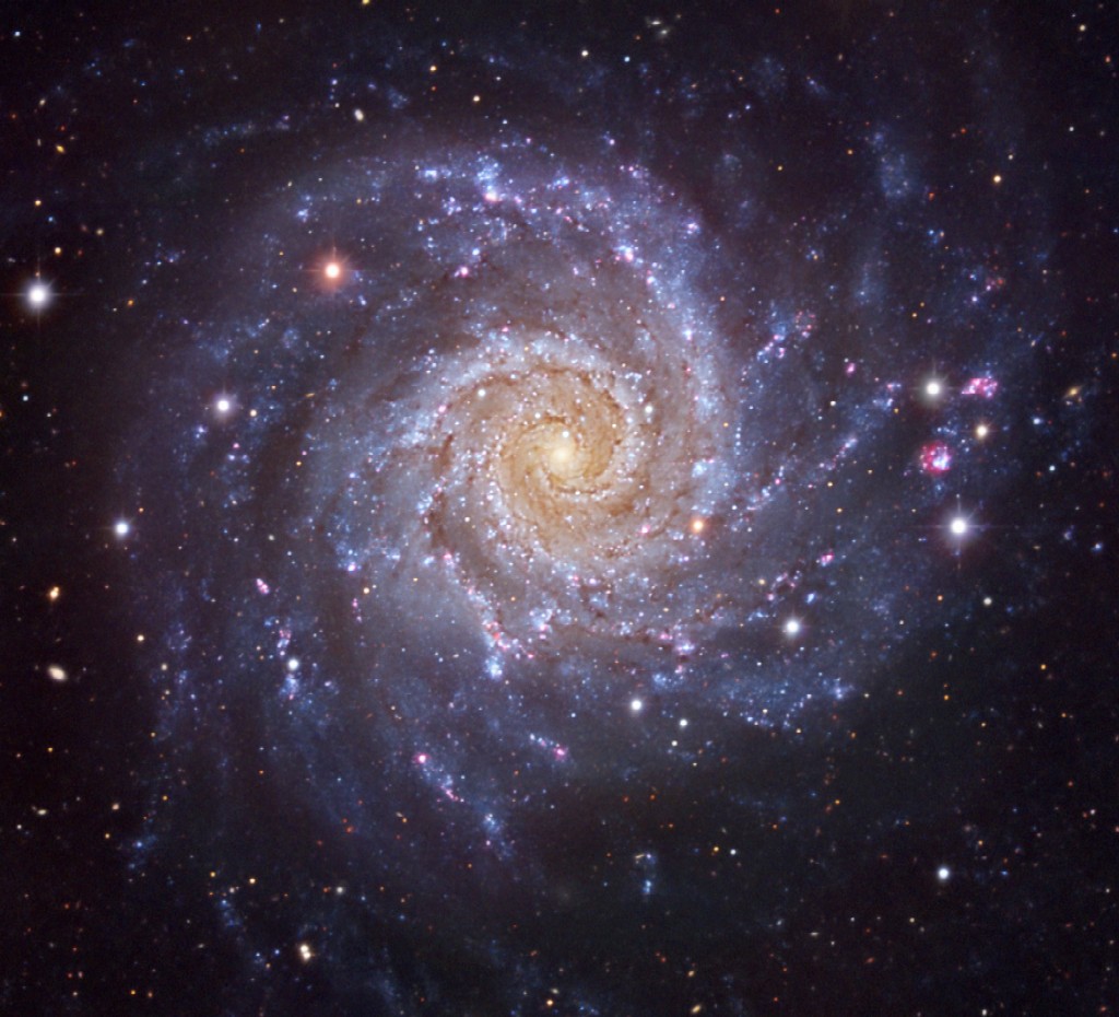 Шарль Мессье удостоил свой каталог всего лишь одним объектом созвездия. И неудивительно, находясь вдалеке от плоскости Млечного Пути, созвездие богато в основном галактиками, но не очень яркими. М74 - спиральная галактика с блеском 9,1m и видимыми размерами 10,5' × 9,5'. Расположена на расстоянии около 30 млн. св. лет от нас и содержит около 100 миллиардов звезд. По отношению к нам галактика расположена практически плашмя. Благодаря относительно ярким спиральным ветвям и, чередующимся с ними, газопылевым облакам в 200-250 мм телескопы на темном небе можно различить спиральную структуру галактики. Для меньших телескопов она выглядит туманным круглым пятном. Поверхностная яркость её не очень велика, что делает обнаружение для малых телескопов нелегкой задачей, в особенности на засвеченном небе. В 2002, 2003 и 2013 годах в галактике вспыхивали сверхновые звезды, причем сверхновую 2002 года из-за её необычайной яркости некоторые астрономы относят к гиперновым.