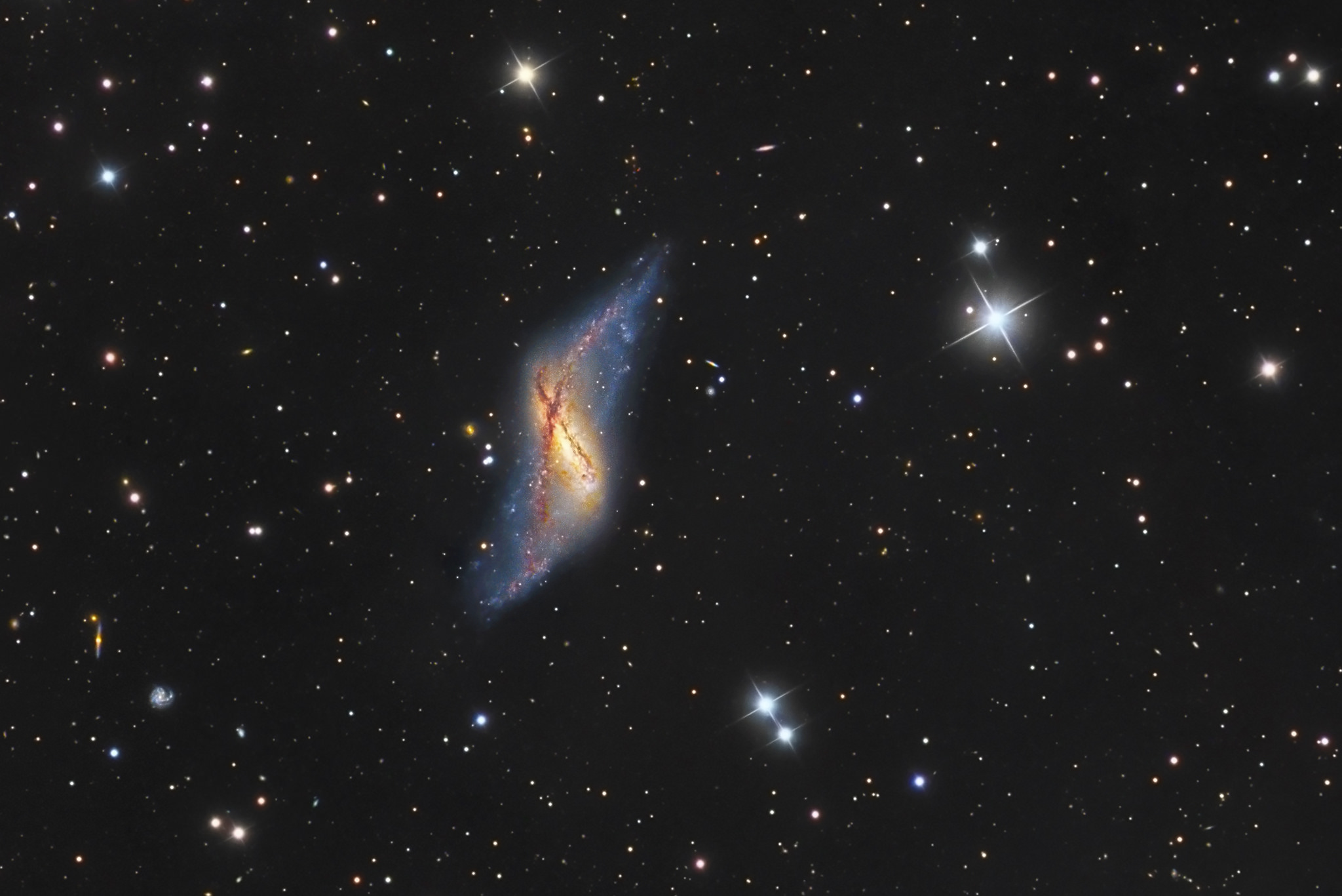 Не такое уж оно и бедное Возможно не яркое, не броское, но не бедное - в нем столко замечательных и интересных объектов. Вот посмотрите на NGC 660 — спиральную галактику с перемычкой и полярным кольцом. Такая структура галактики является результатом слияния двух меньших галактик в одну. Возможно в далеком будующем, после слияния Млечного Пути и Туманности Андромеды, образуется подобная галактика. Автор фото Patrick Gilliland