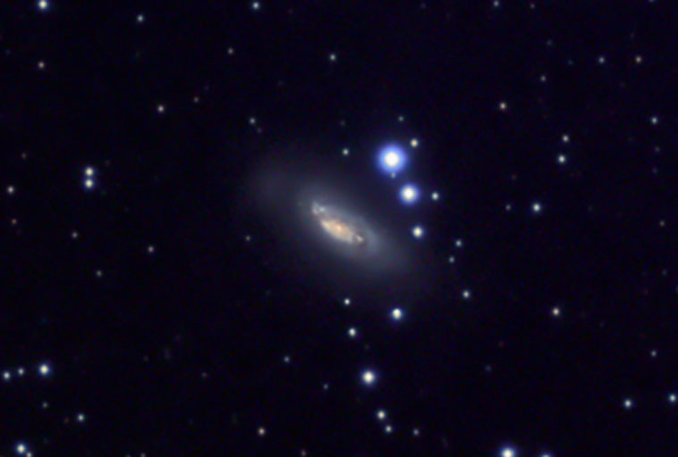 NGC 821 - спиральная галактика. Имеет блеск 11,2m и видимые размеры 2,6' × 1,6'. Примерный вид галактики в небольшой телескоп. Её можно различить рядом с относительно яркой звездой.