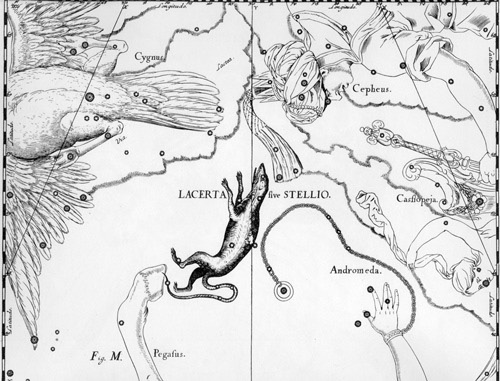 Латинское название: Lacerta (сокращенное Lac). Это околополярное созвездие северного полушария неба - одно из "молодых" созвездий. Было введено известным польским астрономом Яном Гевелием в 1687году. Большая часть созвездия в наших широтах является незаходящей, и потому оно видно круглогодично. Но, лучшим временем для наблюдений считаются теплые августовские и сентябрьские ночи. Но найти созвездие на небе задача не из простых, особенно для новичков. В созвездии имеется всего одна звезда ярче 4m. Искать его надо между созвездиями Лебедя и Андромеды. Наиболее яркие звезды созвездия β, α, 4, 5 и 2 образуют ломаную цепочку звезд, своим видом напоминающую букву «W» или «М» в зависимости от положения на небесной сфере. Из-за этого созвездие иногда называют «маленькой Кассиопеей». Хотя, строго говоря, несколько звезд еще продлевают эту цепочку. Занимает на небе площадь в 200,7 квадратных градусов и содержит 35 звезд, видимых невооруженным глазом. Карта по Г.Рею.