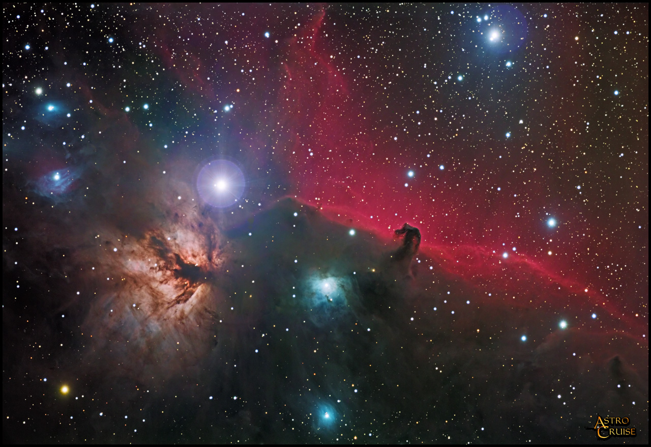Barnard 33 (Туманность Конская Голова) – темная туманность, расположенная на фоне светлой эмиссионной туманности IC 434 южнее звезды Альнитак (ζ Ориона). Пожалуй, благодаря своей форме, является одним из известнейших даже за пределами круга астрономов и любителей астрономии объектом нашего неба. Сходство с конской головой просто поражает! Чего только не бывает на просторах космоса! Конечно же, такой вид туманность имеет при наблюдениях с определенного ракурса в определенное время. Пройдет время, может миллион лет, а может и меньше, и на земном небе вид её скорее всего сильно изменится. Темной она выглядит из-за поглощения излучения пылевыми облаками.