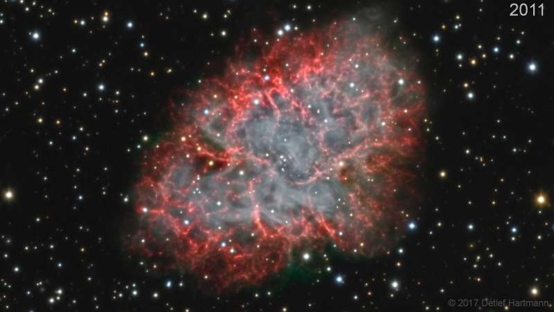 Крабовидная туманность занесена в каталог под номером M1 – это первый объект в знаменитом списке "не комет", составленном Шарлем Мессье. Сейчас известно, что Крабовидная туманность – это остаток вспышки сверхновой, расширяющееся облако вещества, оставшегося после взрыва массивной звезды. Бурное рождение Краба было замечено астрономами в 1054 году. В настоящее время размер туманности – около 10 световых лет, она продолжает расширяться со скоростью примерно 1000 километров в секунду. Расширение было запечатлено в этом замечательном фильме. Каждый год с 2008 по 2017 одним телескопом и камерой на обсерватории с удаленным доступом в Австрии были получены изображения туманности. Для 10 изображений потребовалась полная экспозиция в 32 часа, затем они были смонтированы в видеофильм. На четких кадрах видно также динамичное высокоэнергичное излучение внутри расширяющейся Крабовидной туманности. Крабовидная туманность находится на расстоянии в 6500 световых лет в созвездии Тельца. Авторы и права: Детлеф Хартманн