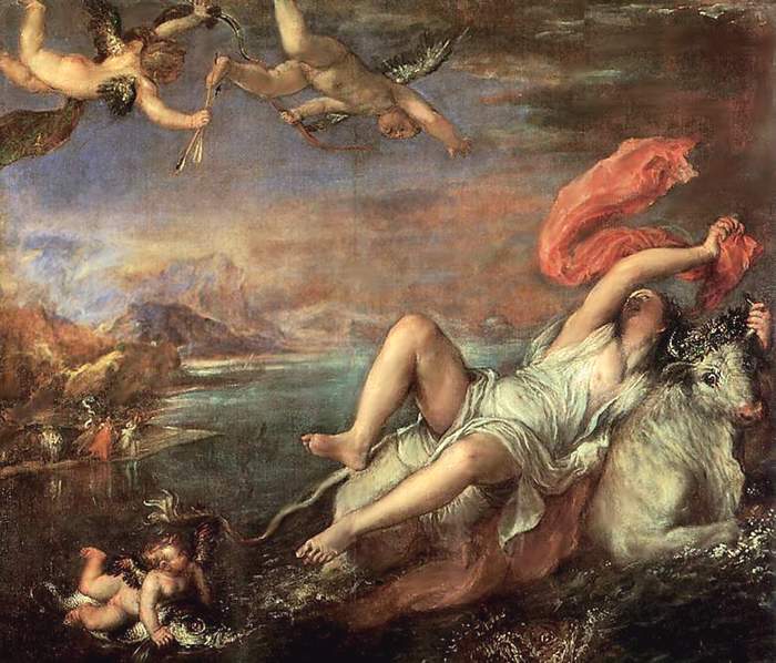 В Древнем Вавилоне созвездие, объединяющие звезды в указанной области неба, называли Небесный Бык. В Древнем Египте оно ассоциировалось со священным быком Аписом. Ничего удивительного в этом нет, так как в древние времена на быках пахали и от них во многом зависели урожай и сама жизнь землепашцев. Согласно одного из древнегреческих мифов Телец это бык, в которого превратился сам Зевс, чтобы похитить прекрасную Европу, дочь короля Финикии Агенора. Он перевез ее из Тира через море на остров Крит. Этот сюжет весьма популярен в живописи. Картина Тициана «Похищение Европы». 1559-62гг.