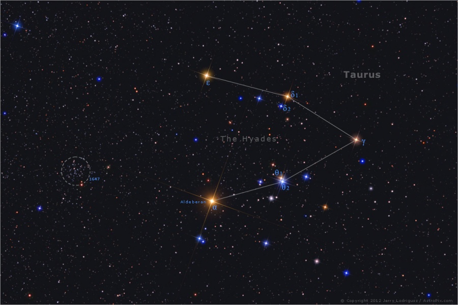 Гиады - рассеянное звездное скопление, ближайшее к Земле. Расстояние до него оценивается в 150 св. лет. Содержит несколько сотен звезд в области диаметром около 20 св. лет. Фактически размеры скопления заметно больше. Вероятно, часть звезд скопления уже «сбежало» из него. Из-за своих видимых размеров в 5,5° даже не воспринимается как физически связанное скопление звезд. Достойный объект для простого бинокля, да и вид невооруженным глазом тоже впечатляет! Ярчайшей звездой скопления выглядит Альдебаран, но он с ним физически не связан и расположен вдвое ближе. В телескоп скопление можно наблюдать только по частям, из-за чего оно очень теряет в своей привлекательности. Ярчайшие звёзды скопления γ, δ, ε и θ образуют вместе с Альдебараном фигуру, похожую на букву «V». Греческое название означает «дождливые». В древнегреческой мифологии Гиады сестры Плеяд.
