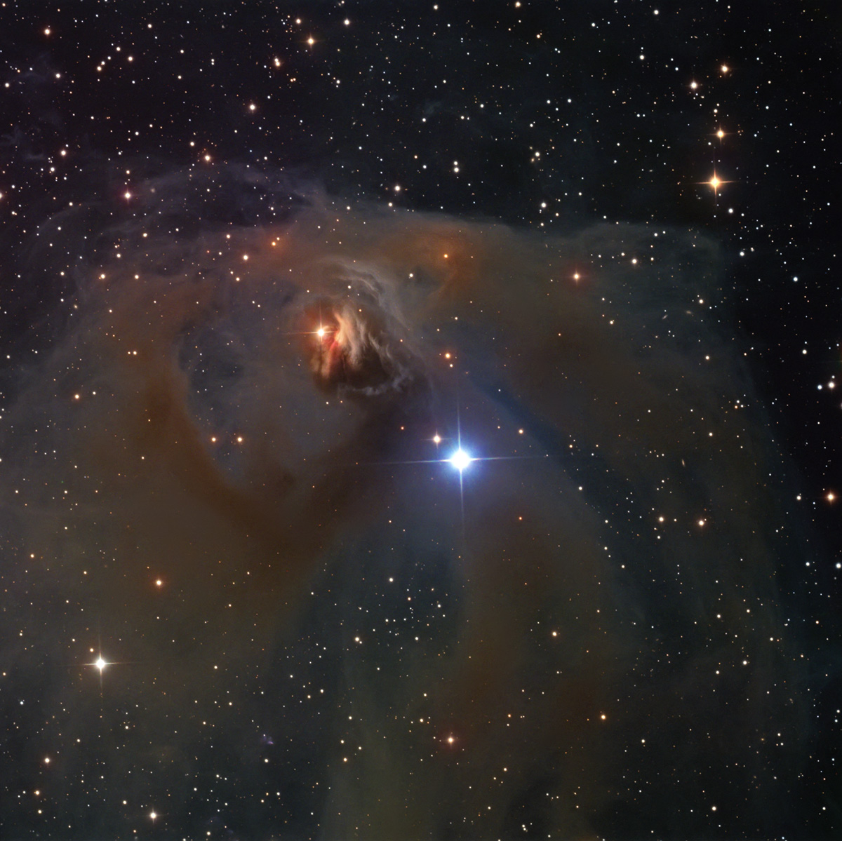 T Tau – является прототипом необычного класса переменных звёзд, изучение которых очень помогает в понимании теории образования звезд. Это очень молодая звезда, которая находится, образно говоря, на пороге вступления на главную последовательность. Располагаются подобные звезды возле молекулярных газовых облаков и отличаются хаотической переменностью блеска. Масса звезд типа T Tau не превышает 2-х солнечных. Термоядерные реакции в недрах таких звезд еще не действуют из-за недостаточной температуры, и потому они светят в основном за счет энергии гравитационного сжатия. Звезда Т Тельца меняет свой блеск в пределах 9,3-13,5m без какой либо периодичности. Находится на расстоянии около 400 св. лет от нас и проецируется на рассеянное скопление Гиады, к которому никакого отношения не имеет. Является тройной звездой, но в оптическом диапазоне видна только одна звезда, две другие обнаруживаются в инфракрасных лучах. На астрофото вокруг звезды T Tau проявляется отражательная туманность NGC 1555, которая. Вероятно, и послужила источником вещества для образования T Tau. Эта туманность еще называется «переменной туманностью Хинда», поскольку меняет своей блеск в зависимости от T Tau.