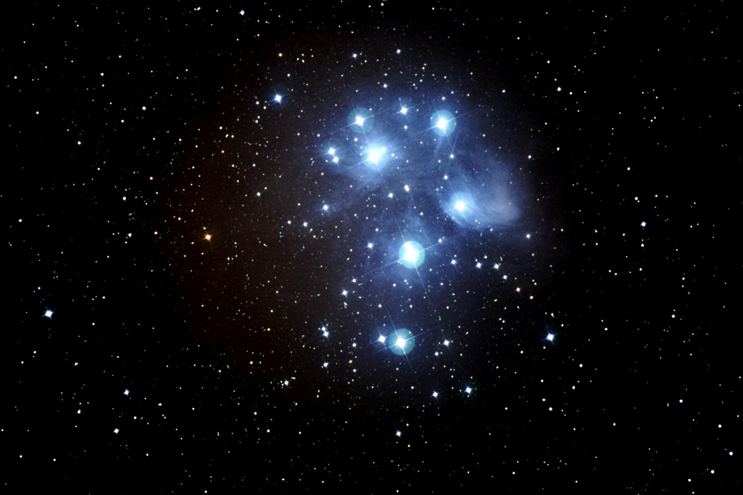М 1 (Крабовидная туманность) – диффузная туманность, несомненно, самый значимый объект созвездия. Но, о ней подробнее в разделе необычных объектов. М 45 (Плеяды) - рассеянное звездное скопление, одно из ярчайших и ближайших к Земле. К тому же его своеобразная форма, похожая на ковш, сразу привлекает внимание даже обывателя, а некоторые из них принимают Плеяды за Большую Медведицу! Наблюдается с древнейших времен. Содержит около 1000 (а, возможно, и до 3000) звезд и большое количество коричневых карликов в области диаметром около 12 св. лет. Расстояние до скопления около 440 св. лет. На фотографиях скопления видно, что оно погружено в светлую туманность. Часто скопление называют «Семь сестер», а в Украине и России издревле известно название «Стожары». Имеет интегральный блеск 1,6m и видимые размеры 110′. Просто замечательный объект для наблюдений в бинокли и малые телескопы. В темную морозную ночь кажется, что звезды скопления своим светом стараются уколоть глаз наблюдателя! Невооруженным глазом обычно видно 6-7 звезд. В обычный бинокль различается до 3-х десятков звезд, а в средний телескоп порядка сотни. При хорошем небе в крупный любительский телескоп есть шанс различить туманность, в которую погружены Плеяды.