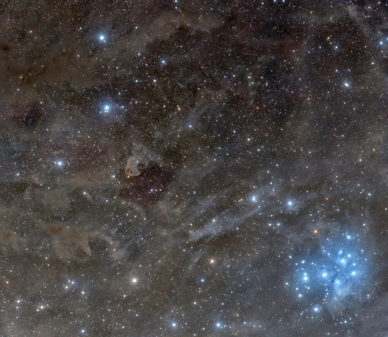 Знаменитое звездное скопление Плеяды медленно разрушает пролетающее мимо облако газа и пыли. Плеяды – самое яркое рассеянное скопление на небе Земли, его можно увидеть невооруженным глазом практически из любой точки северного полушария. Проплывающее мимо молодое облако из газа и пыли, скорее всего, является частью пояса Гулда – необычного кольца из областей звездообразования, расположенного вокруг Солнца, в местной части Млечного Пути. В течение последних 100 тысяч лет часть пояса Гулда движется сквозь более старое скопление Плеяд, вызывая бурные реакции между звездами и пылью. Световое давление излучения звезд отталкивает пыль в небольшой голубоватой отражательной туманности вокруг скопления, причем более мелкие частицы пыли разлетаются быстрее. В результате некоторые части газо-пылевого облака приобрели форму волокон и расслоились. На этом глубоком изображении запечатлена также комета C/2015 ER61 (PanSTARRS), она видна внизу слева. Авторы и права: Хуан Карлос Касадо, Мигель Серра-Рикарт и Даниэль Падрон