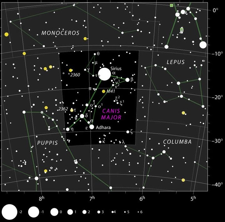 Созвездие Большой Пес В первом сообщении будет постоянно обновляться информация об этом созвездии и объектах в нем. В теме Вы можете оставлять свою информацию, задавать вопросы и получать ответы об объектах этого созвездия.