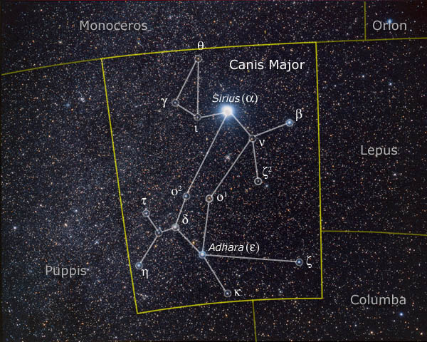 Сириус (α CMa) – ярчайшая звезда нашего ночного неба, имеет блеск -1,47m! Это одна из ближайших к Солнцу звезд, расположенная на расстоянии 8,6 св. года. Древнегреческое название означает «яркий» или «блестящий». Темными морозными зимними ночами, располагаясь невысоко над горизонтом, он красиво переливается всеми оттенками бело-синего. Не удивительно, что Сириусу в древности поклонялись многие народы. Особенно Сириус почитался древними египтянами, и был у них священной звездой, небесным воплощением Исиды, одной из величайших богинь древности. По наблюдениям Сириуса египетские жрецы предсказывали разлив Нила, от которого зависел урожай. В древнем Риме утренняя видимость Сириуса совпадала с началом летней жары, на время которой прекращались многие работы и начинались «собачьи дни» - каникулы. Латинское название звезды Сириус — «Каникула» — означает «маленькая собачка». Многим современным школьникам и студентам , не говоря уже о парламентариях, даже невдомек, откуда произошло название для самого беспечного времени учебы или работы. С Сириусом связано несколько загадок. Один из известнейших астрономов древности Клавдий Птолемей описывал Сириус красной звездой! Ему вторил известный философ Сенека. Общепринятого решения этой загадке сейчас нет. Вторая загадка связана с африканским племенем догонов, которые, якобы, знали о спутнике Сириуса задолго до их контакта с европейской цивилизацией. Впрочем, достоверность этой загадки сомнительна. Спутник Сириуса – белый карлик был «открыт на кончике пера» в 1844 году немецким астрономом Фридрихом Бесселем после изучения видимого движения Сириуса по небу. И только через 18 лет спутник удалось обнаружить визуально во время испытаний 46-см рефрактора Альваном Кларком. Вместе со звездами Бетельгейзе (α Ориона) и Проционом (α Малого Пса) Сириус образует одну из вершин, так называемого, «зимнего треугольника».