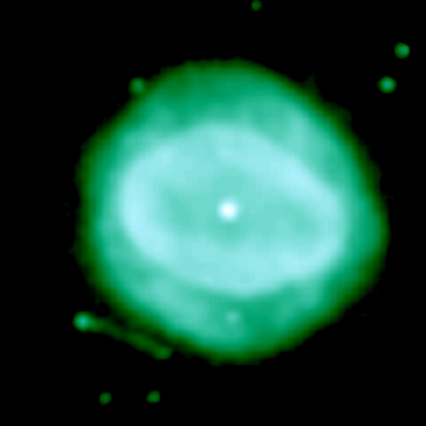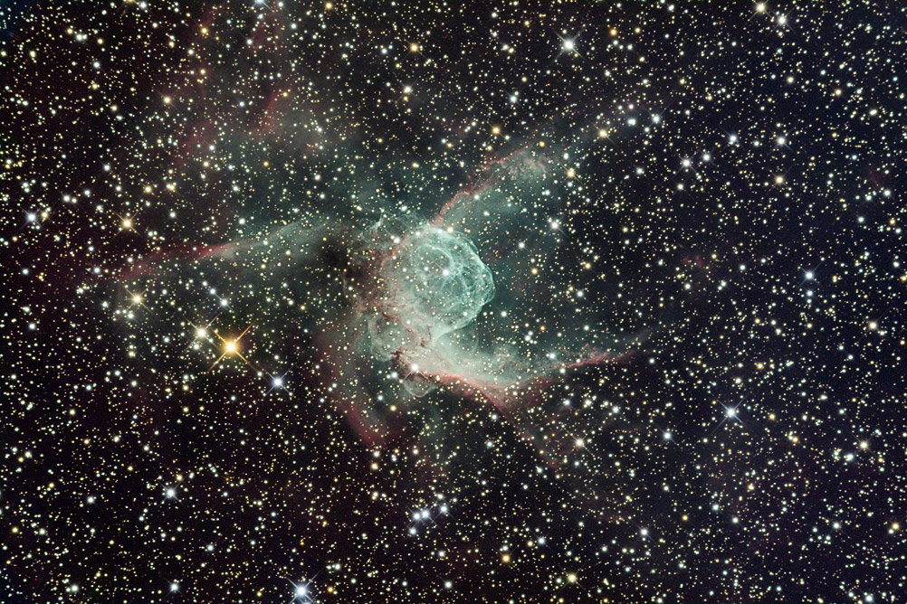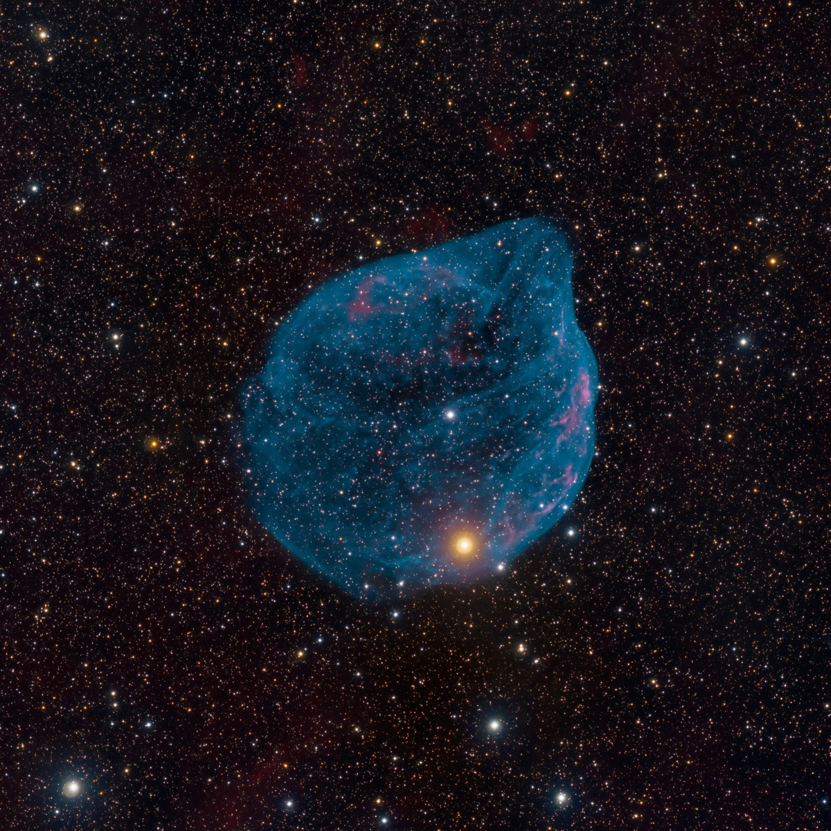 Еще одно фото и комментарии к нему: Выдутый быстрым ветром горячей, массивной звезды, этот космический пузырь огромен. Он занесен в каталог как Шарплесс 2-308 и находится на расстоянии около 5200 световых лет в созвездии Большого Пса. Его видимый угловой размер на небе больше диска полной Луны, что соответствует диаметру в 60 световых лет. Массивная звезда, создавшая пузырь, принадлежит к звездам Вольфа-Райе – это яркая звезда около центра туманности. Масса звезд Вольфа-Райе более чем в 20 раз превышает массу Солнца, предполагается, что это короткая стадия эволюции массивных звезд, которая завершается взрывом сверхновой. Быстрый ветер звезды Вольфа-Райе создал туманность, имеющую форму пузыря, выметая медленно двигающееся вещество, сброшенное звездой на более ранних стадиях эволюции. Возраст этой выдутой ветром туманности – около 70 тысяч лет. Относительно слабое излучение, запечатленное на этом широкоугольном изображении, в основном обусловлено свечением ионизованных атомов кислорода, изображенным синим цветом. Авторы и права: Анис Абдул
