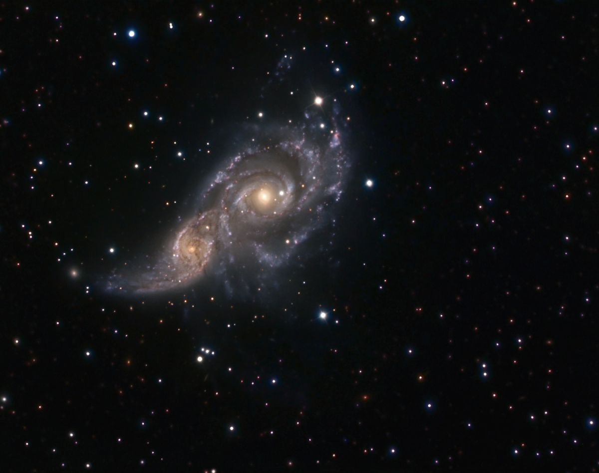 NGC 2207 и IC 2163 – пара взаимодействующих спиральных галактик. Расстояние до них около 120 млн. св. лет. Блеск основной галактики 11,0m и видимые размеры 3,9' × 2,2'.