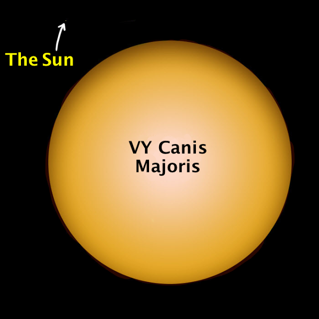 VY CMa – красный гипергигант. Одна из крупнейших и ярчайших среди известных звезд со средним видимым блеском 8,0m (меняет блеск в пределах от 6,5m до 9,6m), расположенная на расстоянии около 3900 св. лет от нас. Радиус звезды меняется в результате пульсаций от 1300 до 1540 солнечных! На месте Солнца поверхность звезды находилась бы между орбитами Юпитера и Сатурна! Светимость при этом составляет 270000 солнечных! Сравнение размеров VY CMa и Солнца.