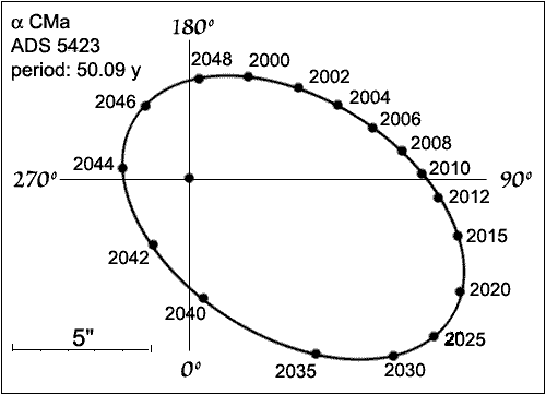α CMa (Сириус) – главная звезда созвездия белого цвета с блеском -1,47m имеет слабого компаньона белый карлик с блеском 8,5m на расстоянии около 10''. Расстояние сейчас близко к максимальному 11", которое будет достигнуто в 2024 году. Казалось бы, в чем трудность увидеть спутник Сириуса при его то яркости? Но, не тут то было. Сириус А забивает его своим блеском. Различить спутник Сириуса в настоящее время можно с телескопом 150-200 мм, но только при хороших атмосферных условиях и хорошей оптике. Так что, наблюдение спутника Сириуса для средних телескопов относится к сложным, но увлекательным задачам. Период обращения в системе 49,98 года. Масса белого карлика около солнечной, что недалеко от предела Чандрасекхара. Орбита спутника.