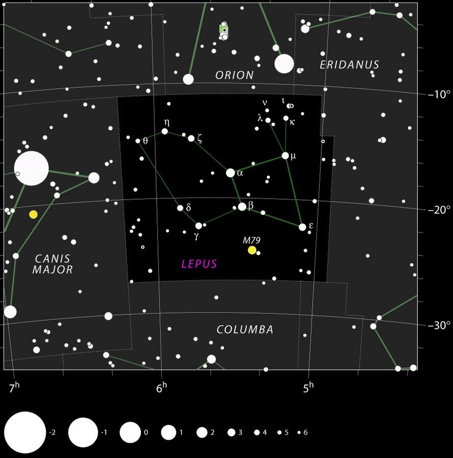 Несмотря на малость созвездия, один объект каталога Мессье все же присутствует. М79 - шаровое скопление. Блеск 8,6m, видимый размер 8,7'. Расположено на расстоянии 40,0 тыс. св. лет от нас и 60,0 тыс. св. лет от центра Галактики. Согласно современных оценок диаметр скопления 104 св. года, содержит оно около 150 тыс. звезд и имеет возраст около 11,7 млрд. лет. Считается, что это шаровое скопление не принадлежит нашей Галактике, а является спутником карликовой Галактики Большого Пса, ближайшей к нам галактики. В каталоге Мессье есть ещё только одно внегалактическое шаровое скопление – М54 (спутник карликовой галактики в Стрельце), хотя можно вспомнить, что не все астрономы признают само существование карликовой Галактики Большого Пса! Потому вопрос о принадлежности М79 решен еще не окончательно. Содержит много красных гигантов. Кстати, это скопление является самым южным объектом каталога Мессье, и потому в наших широтах его наблюдение весьма затруднено. Само скопление довольно компактно и может быть обнаружено даже в бинокли и небольшие телескопы, а вот для разрешения на звезды крайних областей понадобится телескоп апертурой от 100 мм. В 200-250 мм телескопы только ядро скопления остается неразличимым сгустком звезд.