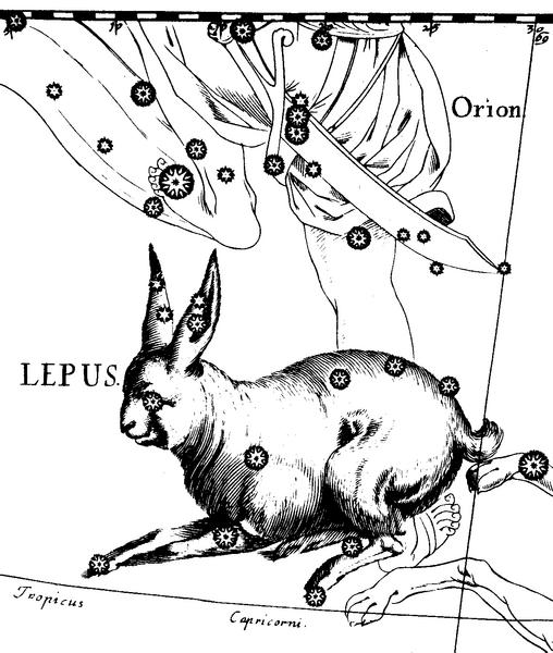В древнегреческой мифологии созвездие, хотя и не столь явно, связано с мифом о легендарном охотнике Орионе, сыне Посейдона и Эвриалы. Орион в основном занимался тем, что гулял лесами Киферона и охотился на разных зверей. При этом его сопровождали его верные псы – Большой Пес и Малый Пес. Орион утверждал, что нет такого животного, которого он бы не смог добыть. Но, с другой стороны, он был человеком добрым. Однажды Большой Пес заметил Зайца и погнал его. Бедный Заяц, ничего не соображая от страха, забился под ноги самому охотнику. Орион пожалел бедное животное и не дал своим собакам разорвать его. Так теперь и расположены на небе эти созвездия рядышком. Согласно другой легенде, бог ловкости (и т.д. и т.п.) Гермес разместил на небе Зайца из-за его быстроты. Вот так все просто. Есть ещё предположение, что Заяц ,как символ плодовитости, атрибут богини Афродиты. А вот в китайской системе созвездий там находится Туалет!