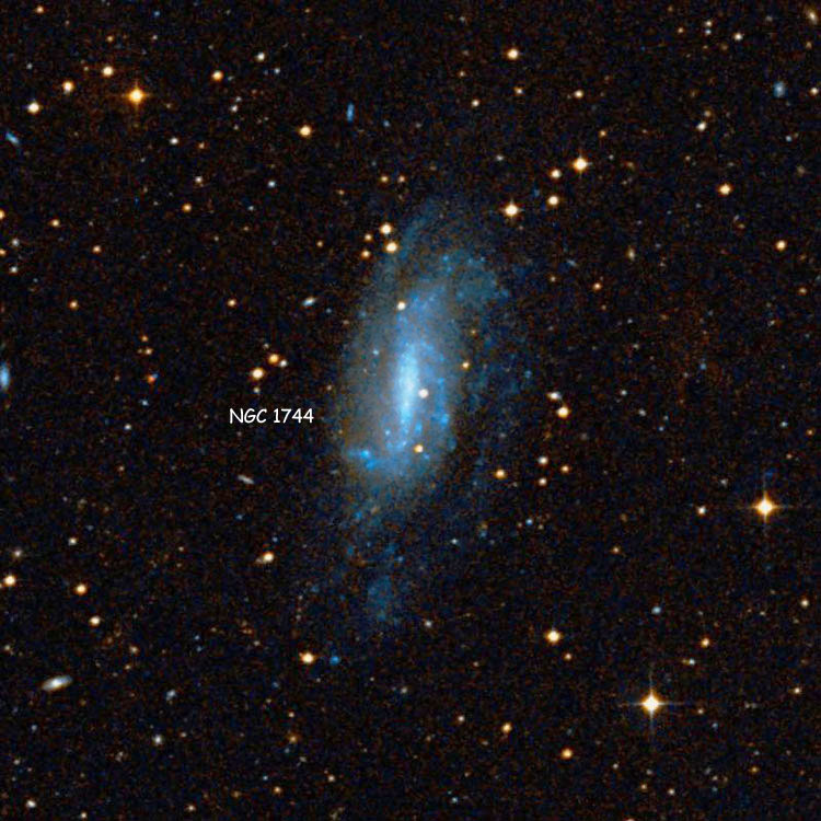 NGC 1744 - спиральная галактика, имеет блеск 11,1m и видимые размеры 7,4' × 3,5'. Со склонением (-) 26° в наших широтах малодоступный объект.