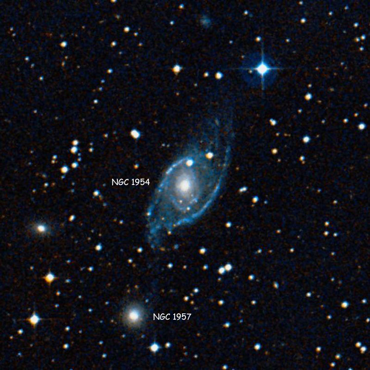NGC 1954 - спиральная галактика, имеет блеск 11,8m и видимые размеры 4,2' × 2,0'. Довольно интересная на вид галактика на фото с крупных телескопов. В телескопы с апертурой 300 мм рядом можно различить галактику NGC 1957. В наших широтах сравнительно доступный объект.