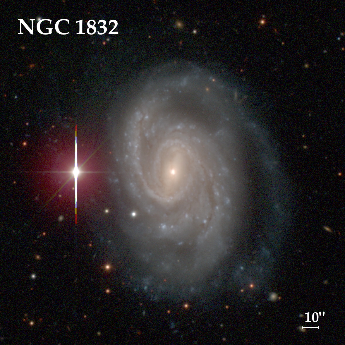 NGC 1832 - спиральная галактика, имеет блеск 11,3m и видимые размеры 2,6' × 1,7'. Красивая галактика, расположенная рядом со сравнительно яркой звездой, облегчающей её обнаружение.