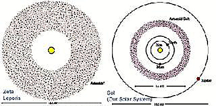 ζ Lep – эта звезда с видимым блеском 3,55m расположена на расстоянии 70,2 св. года от нас. В 1983 году с помощью орбитального телескопа IRAS у неё был обнаружен пылевой диск, расположенный очень близко к звезде. Потому и температура его заметно выше подобных дисков других звезд. В июне 2001 года на обсерватории Кека у звезды был обнаружен пояс астероидов, масса которого примерно в 200 раз больше аналогичного в Солнечной системе. Возможно, все это свидетельствует о процессе образования планетной системы. Ведь звезда очень молодая, ей всего то около 100 млн. лет. Звезда движется относительно Солнца со скоростью 245 км/с и согласно расчетов около миллиона лет назад прошла на расстоянии всего 4-5 св. года от Солнечной системы. Сравнение систем ζ Lep и Солнца.