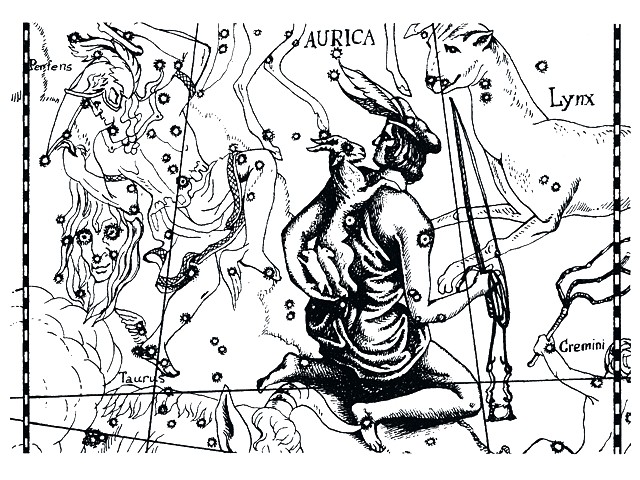 Латинское название: Auriga (сокращенное Aur). Это созвездие северного полушария неба - одно из самых древних. Включено в каталог звёздного неба Клавдия Птолемея «Альмагест». Расположено оно севернее хорошо заметных созвездий Близнецов и Тельца. Впрочем, и сам Возничий уж никак не относится к малозаметным собратьям! Одна только яркая Капелла, отличающаяся своей желтизной, уже привлекает к себе внимание. Главная фигура созвездия образует хорошо заметный пятиугольник, а звезды Капелла (α Aur), ε (Алмааз), ζ (Садатони ) и η образуют хорошо известный астеризм «Козлята», в котором первая из них изображает Козу, а три другие Козлят. В средних широтах большая часть созвездия является незаходящей, потому оно видно практически круглогодично. В короткие и светлые летние ночи желтая Капелла, находясь низко над северным горизонтом, весело подмигивает любителям полюбоваться красотой серебристых облаков. А наилучшим временем для наблюдения созвездия являются декабрь и январь, когда оно находится вблизи зенита. Созвездие занимает на небе площадь в 657 квадратных градусов и содержит около 90 звёзд, видимых невооруженным глазом. На удивление в созвездии нет звезды γ Aur. А раньше такая звезда была и считалась одновременно звездой β Tau! Но, в последствии эта звезда была отдана во владение Тельцу! Интересно, что недалеко от звезды Менкалинан (β Aur) расположен антицентр Галактики. Возможно, из-за этого созвездие, находящееся в плоскости Галактики, сравнительно бедно звездами.Карта по Г.Рею.