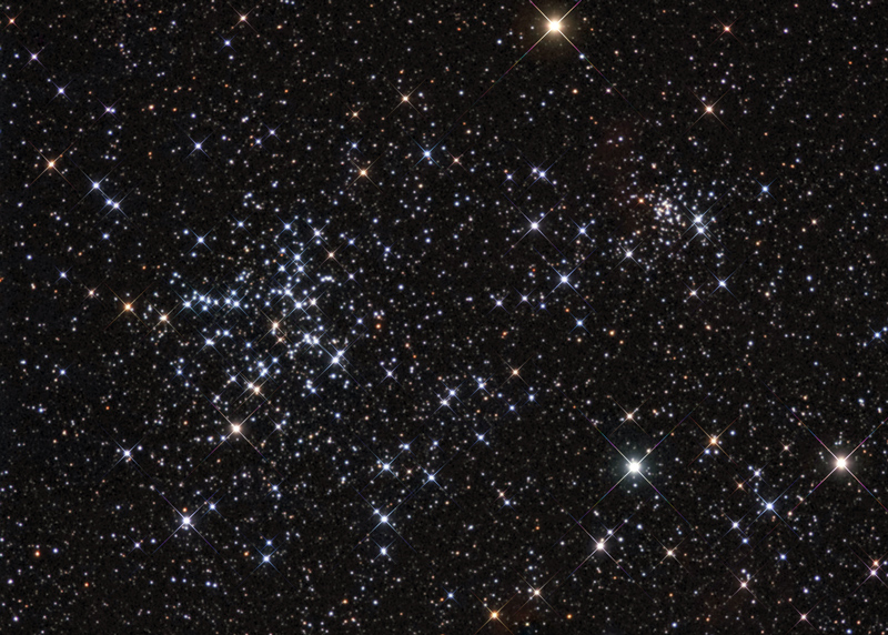 М38 – сравнительно яркое и красивое рассеянное звездное скопление, имеет видимый блеск 7,4m и видимые размеры 21,0'. Находится на расстоянии около 4200 св. лет от нас. При диаметре до 50 св. лет содержит более сотни звезд, ярчайшие из которых имеют блеск около 9m. Без труда видно в бинокль, а в «Алькор» уже можно различить несколько звезд на фоне тумана скопления. В 114-мм телескоп великолепно видно до полусотни звезд. В 200-мм выглядит изумительно с широкоугольным окуляром. Некоторые любители астрономии с развитым воображением видят в этом скоплении «След динозавра»! NGC 1907 – компактное рассеянное звездное скопление, расположенное рядом с М38, имеет видимый блеск 8,2m и видимые размеры 7,0'. Находится на расстоянии около 4500 св. лет от нас. В 200-мм телескоп можно различить до 3-х десятков звезд. Фото М38 и NGC 1907.