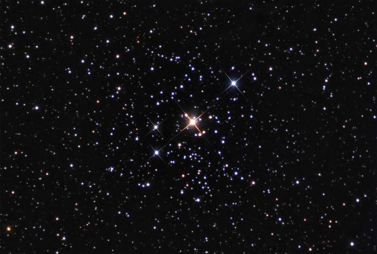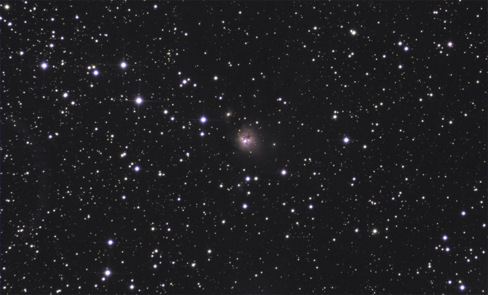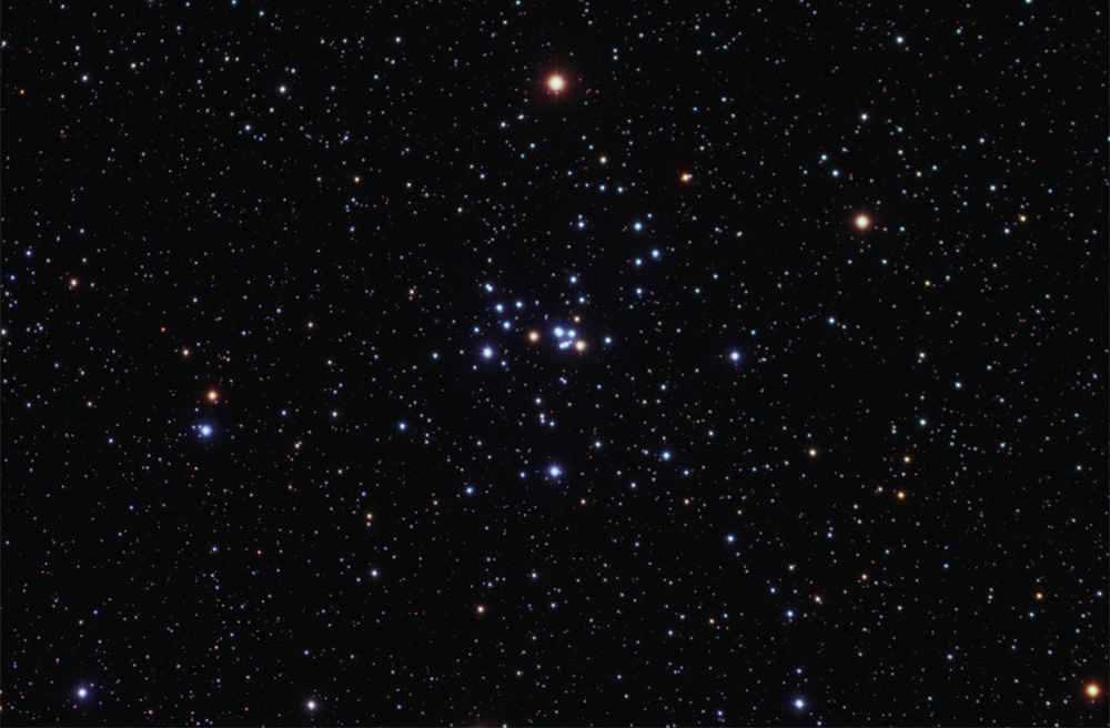 М37(Январская проседь) – яркое и красивое рассеянное звездное скопление, имеет видимый блеск 6,2m и видимые размеры 24,0'. Находится на расстоянии около 4400 св. лет от нас и при 50 св. годах в диаметре содержит не менее 500 звезд, ярчайшие из которых имеют блеск около 10m. Легко может быть найдено в бинокль или искатель телескопа, но даже в «Алькор» выглядит туманным пятнышком. В 114-мм телескоп на фоне тумана различаются искорки звезд. Великолепно смотрится в 200-мм телескоп! Более сотни желтоватых и белых звезд блестят в поле зрения окуляра с заметной концентрацией к центру. При этом бывает трудно подобрать наилучшее увеличение. На небольших увеличениях скопление здорово выглядит на окружающем более темном фоне, а при увеличениях от 100х оно выглядит не таким объемным, зато все поле зрения усеяно красивыми звездочками.