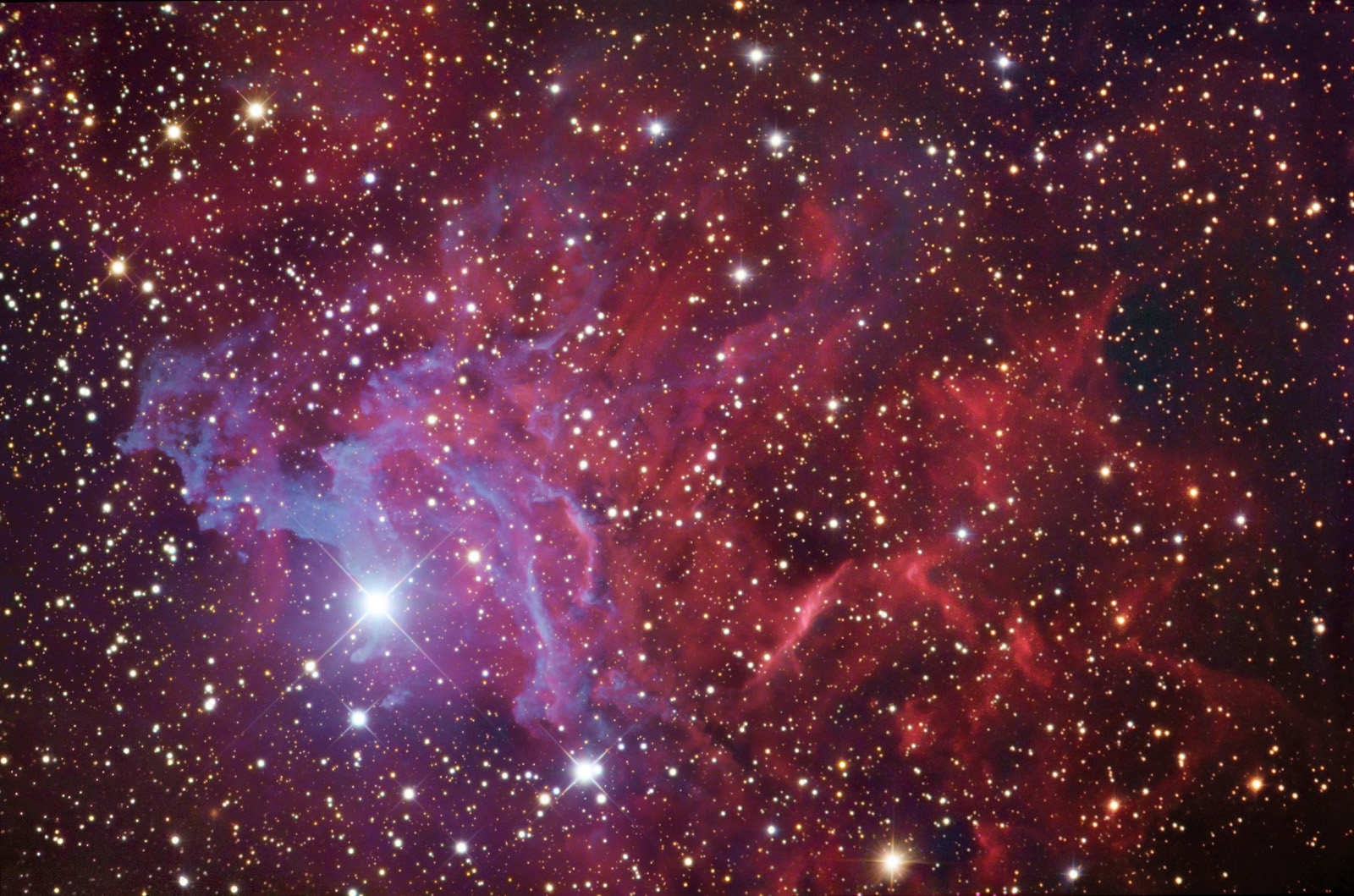 Эмиссионно-отражательная туманность IC 405 в созвездии Возничего, вокруг молодой и горячей голубой звезды AE Возничего. Этот удивительный объект называют также туманностью Пылающей Звезды. Она имеет размер около 5 световых лет и расположена в 1500 световых годах от Земли. Собственное движение звезды AE Возничего показывает, что она движется из области пояса Ориона и возможно родилась в знаменитой Большой Туманности Ориона. Автор снимка Efrem Frigeni, Италия.