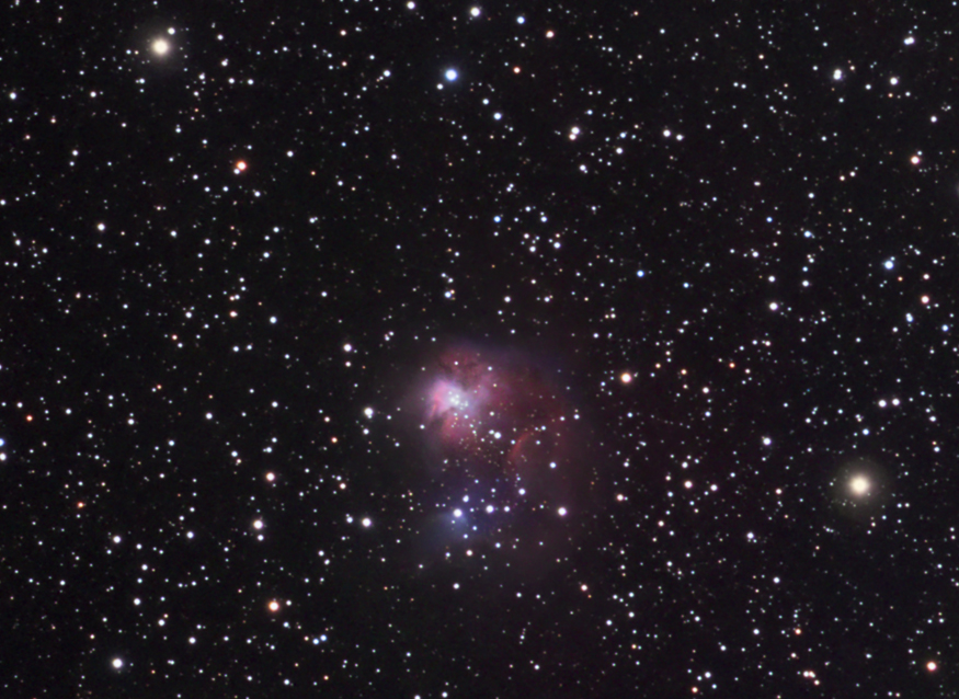 NGC 1664 - рассеянное звездное скопление, имеет видимый блеск 7,6m и видимые размеры 18,0'. Находится на расстоянии около 3900 св. лет от нас. Размеры скопления около 43 св. лет, и к компактным его не отнесешь, в чем можно убедиться при его наблюдениях. Удивительную форму имеет скопление. Довольно яркие звезды образуют фигуру цветка, которая мне напоминает гвоздику. Кому то больше напоминает водоворот. В «Алькор» оно видно едва различимой звездной сыпью, в 114-мм очень даже неплохо. Но, больше всего мне понравилось в 200-мм телескоп с увеличением 60х и полем зрения 50'.