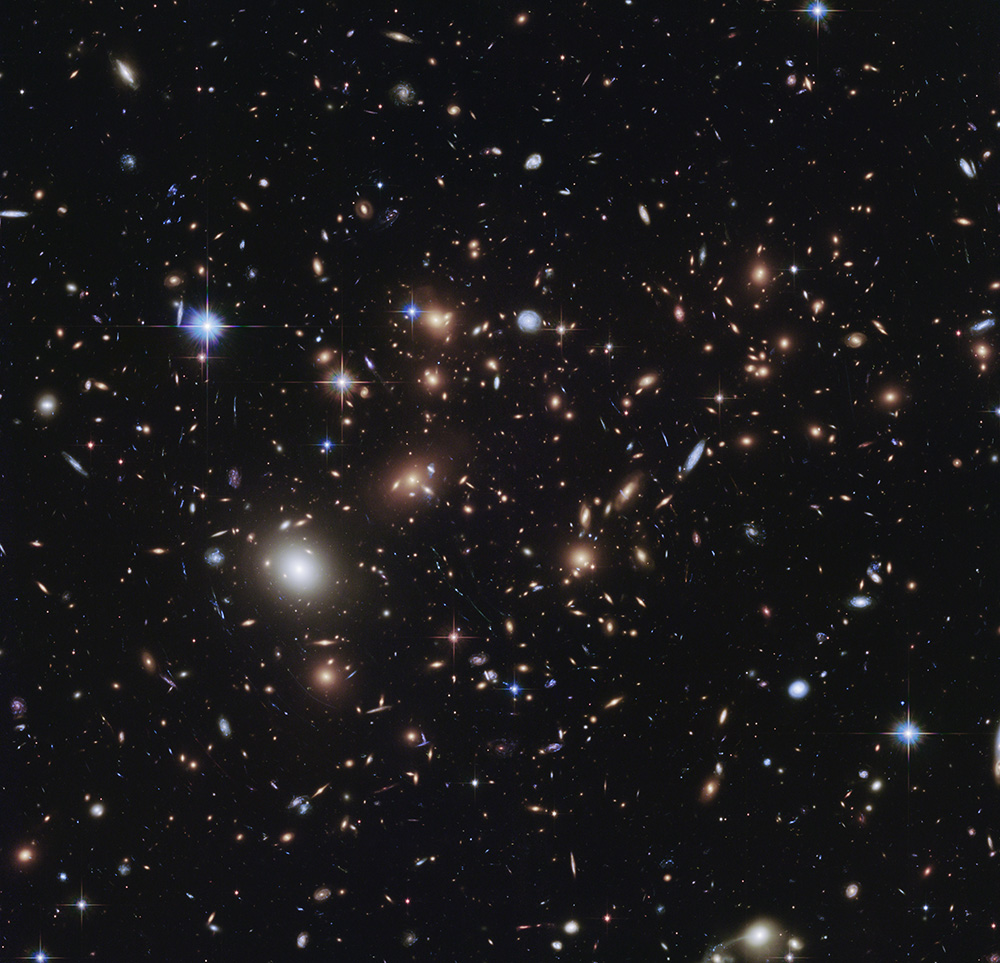 MACS J0717.5+3745 — крупное скопление галактик. Находится на расстоянии около 5,4 млрд. св. лет от нас. Особый интерес представляет тем, что в данной области пространства сталкиваются сразу 4 скопления галактик! Это единственный известный на сегодняшний день подобный случай столкновения в таких грандиозных масштабах! Если звезды галактик проходят друг мимо друга, лишь со временем теряя скорость и меняя свои орбиты, то гигантские скопления газа тормозятся намного резче. При этом газ нагревается и излучает в рентгеновском диапазоне. Фото MACS J0717.5+3745, полученное «Хабблом».