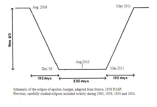 ε Aur (Алмааз) - затменно-двойная звезда, изменяющая свой блеск в пределах 2,92-3,8m. Казалось бы, обычная затменная переменная, мало чем отличающаяся от широко известных Алголя (β Per) или Шелиак (β Lyr). Но, в отличие от этих «непосед», звезды, составляющие систему ε Aur, движутся величественно и неторопливо! Ведь период изменения блеска в этой паре составляет целых 9884 суток, то есть более 27 лет! Это максимальный период среди известных звезд этого типа! Само затмение длится около 640 суток, а это почти 2 года! Тем не менее, темный компаньон не различался в телескопы! Что же это за монстр такой? После наблюдений с космического телескопа «Спитцер» астрономы склонились к выводу, что спутником главной звезды является не звезда, а массивный и непрозрачный пылевой диск! Что из него получится в будущем? На это ответа пока нет. Главная звезда, кроме того, пульсирует с периодом 66 суток. График фаз типичного затмения. 2009 08 06 - начало частных фаз затмения 2009 12 21 - начало полного затмения 2010 08 01 - середина затмения 2011 03 12 - окончание полного затмения 2011 05 15 - окончание частных фаз затмения Кривая блеска ε Aur.