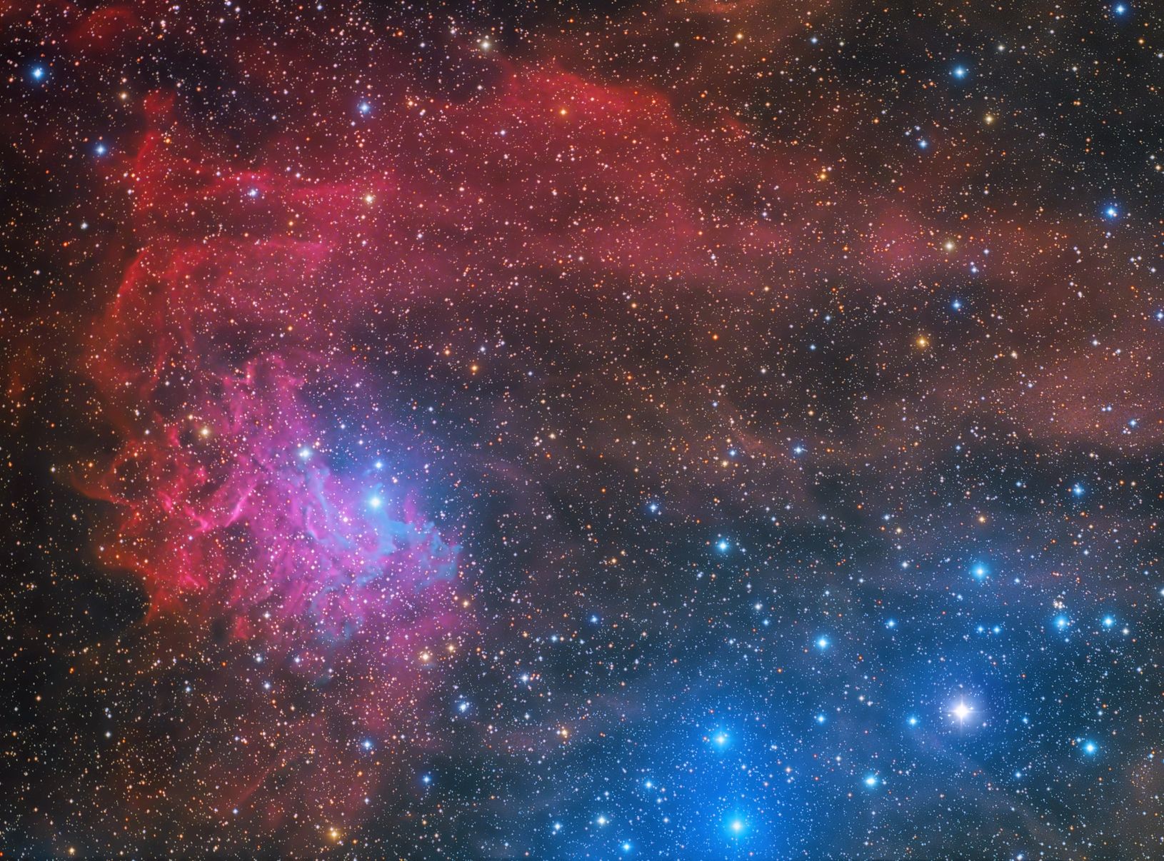 NGC 1893 и IC 410 (Туманность головастик) - рассеянное звездное скопление, погруженное в светлую эмиссионную туманность. Имеет видимый блеск 7,5m и видимые размеры 11,0'. Содержит несколько десятков звезд до 12m. Размеры туманности достигают 55' x 55' при интегральном блеске 10m. Скопление хорошо видно и в небольшие телескопы, а вот туманность различить намного труднее, особенно на засвеченном небе. Понадобится крупный телескоп с фильтром UHC. Для астрофотографов туманность вполне доступна.