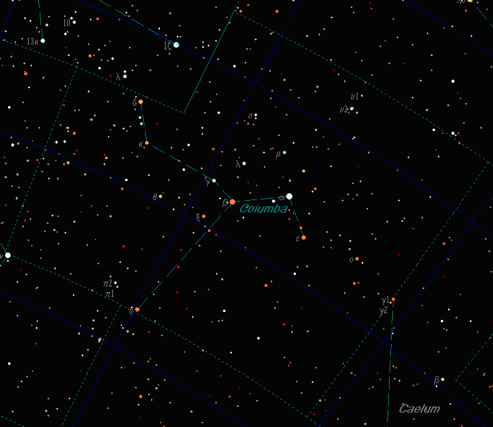 Латинское название: Columba (сокращенное Col). Это небольшое созвездие южного полушария неба - одно из "молодых" созвездий. Было предложено голландским астрономом Петером Планциусом в 1592 году под названием «Голубь Ноя». Располагается оно к югу от созвездия Зайца и к юго-западу от Большого Пса. Так что найти его на небе не так уж и трудно, главные звезды Голубя имеют блеск 2-4m и не образуют ярко выраженной фигуры. Но в наших широтах они не высоко поднимаются над горизонтом, а самая южная часть созвездия немного не дотягивает до восхода. Полностью оно может наблюдаться южнее 47-й параллели. Интересно, что на небесной сфере созвездие находится в противоположном направлении от другой птицы – Лебедя. Наилучшее время для наблюдений – декабрь и январь. Занимает на небе площадь в 270 квадратных градусов и содержит 40 звезд, видимых невооруженным глазом.