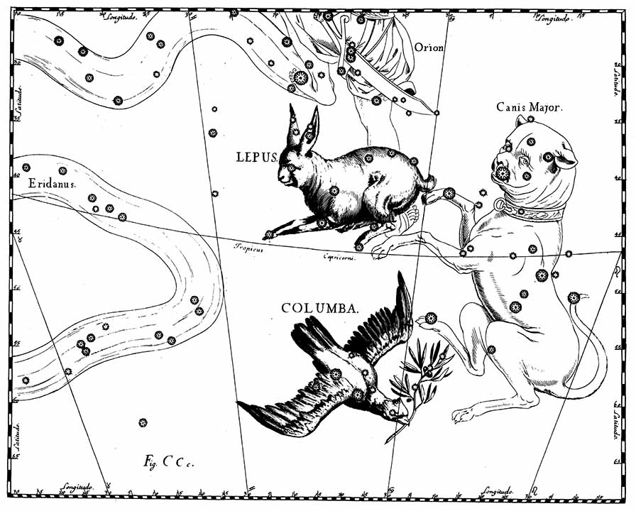 Однако, путь Голубя на небо не был таким уж простым. В 1603 году немецкий астроном Иоганн Байер поместил это созвездие в свою «Уранометрию», но в общий список созвездий его не включил. Только в 1679 году французский астроном Руайе Огюст опубликовал карты звездного неба с созвездием Голубя, название которого, как это часто бывало, немного сократил! Остается только вспомнить, что до этого звезды Голубя входили в созвездие Большого Пса.