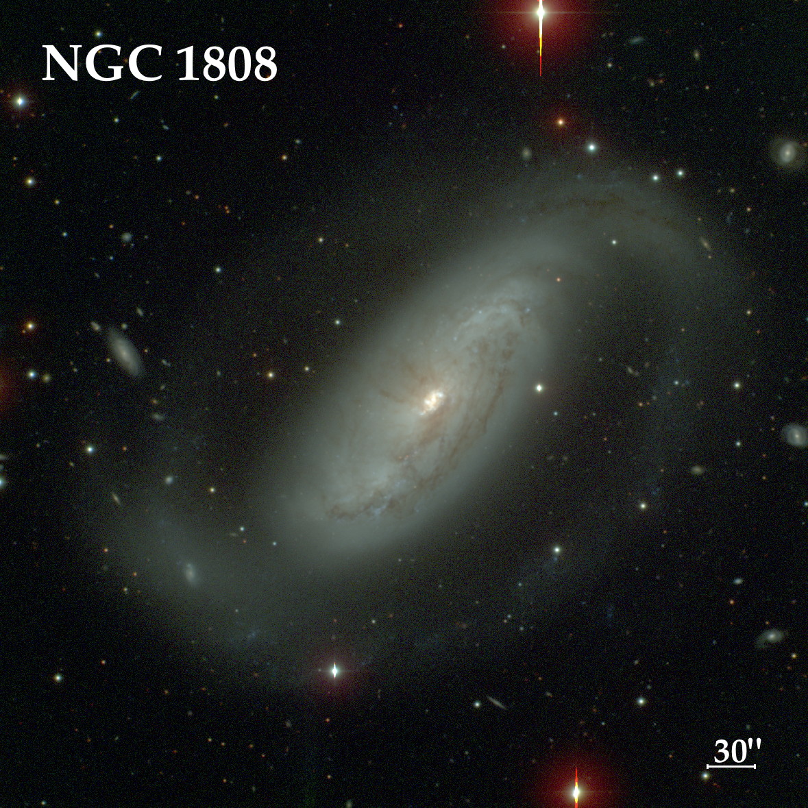 NGC 1808 – очень симпатичная спиральная галактика с перемычкой, довольно яркая с блеском 9,9m и видимыми размерами 6,5' × 3,9'. Расположена на расстоянии 40 млн. св. лет от нас. В ядре галактики обнаружен просто шквал рождения новых звезд! Но склонение -37,5° накладывает ограничения для наблюдателей.
